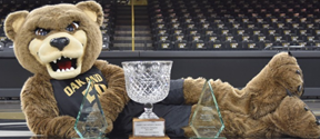 gaining institutional independence from the board in 1970. The university's site comprises the Main Campus, Meadow Brook Estate, and two nationally ranked golf courses spread across 1,443 acres. Meadow Brook Hall, a US National Historic Landmark and the fourth-largest historic house museum in the United States, is located on the site. It was built by the Wilsons between 1926 and 1929 for then $4 million. Meadow Brook Hall About the Golden Grizzlies The Oakland men's basketball program began competing in the 1967 season, 10 years after the university opened. Originally nicknamed the Pioneers, Oakland played at the Division II level until 1997 when they changed their nickname to the Golden Grizzlies and began the transition to Division I. OU opened the Athletics Center O'rena in 1998. When the O'rena was being built, home basketball games were played in the Sports Dome, an inflatable "bubble" used for practice by Oakland's athletic teams during the winter. The original basketball stadium was in the Lepley Sports Center. Their Mascot Grizz Greg Kampe